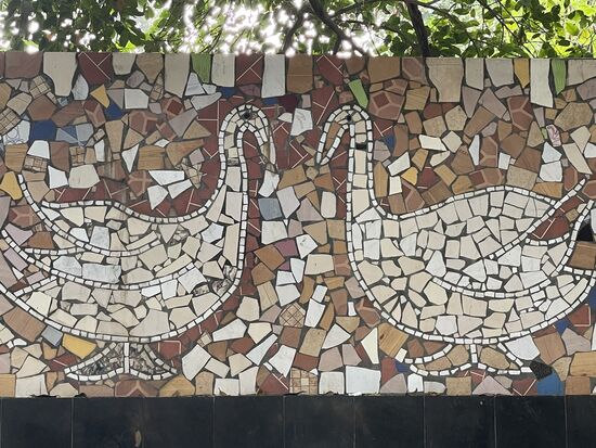 Hier ist das grosse Wasserbecken voll und das Gebäude spiegelt sich im algengrünen Wasser. Wir dürfen uns hier sogar dem grossen farbigen Eingangstor nähern und soviel fotografieren, wie wir wollen. Inzwischen weiss ich etwas mehr über die Gruppe. Es ist ein schweizer Ehe-Paar aus Genf, drei australische junge Männer, die sich anscheinend sehr für Architektur interessieren, ein junges italienisches Paar, das verschmitzt lacht, denn sie hatten es gestern irgendwie geschafft, auf das Gelände zu kommen und waren dabei die allereinzigen auf dem ganzen Komplex. Viel anders als heute wird sich das allerdings nicht angefühlt haben. Sie wurden dann irgendwann von einem Soldaten entdeckt und zurück zum Checkpoint geführt.