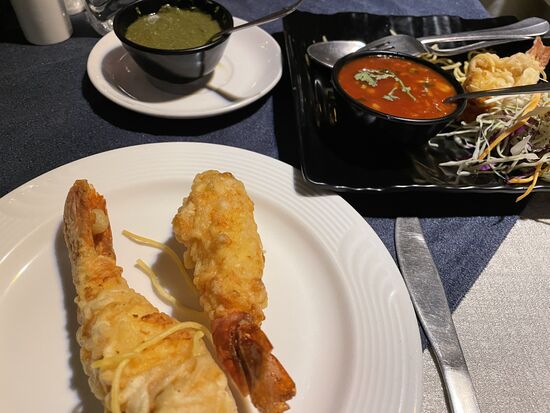 Sachin bringt mich zurück zum Hotel wo ich packe und mich noch einen Moment hinlege. Danach gehe ich ins nahe Hotel Oyster und geniesse ausgebackene Riesencrevetten. Ein kleiner Snack, der mich durch die Nacht bringen wird.
