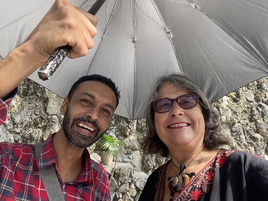 Darf ich mich kurz darunter stellen, ich brauche nur ein Selfie, frage ich und als der junge Mann mich etwas irritiert anschaut, erzähle ich ihm von meinem Spleen mit den Schirmen, die ich immer dann poste, wenn ich wieder weiter reise. Das findet er so lustig, dass er den Schirm kurzerhand abmontiert und sich mit mir darunter stellt. Ein gemeinsames Selfie bitte.