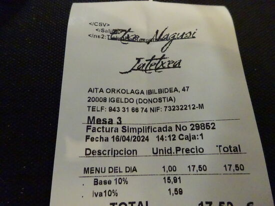 Da ich ja heute an diesem Regentag "frei" hatte, bin ich zum Lunch mal in ein Restaurant, ein paar Minuten Richtung San Sebastian gelaufen, um dort was zu essen. Das Restaurant auf dem CP hat mich nicht überzeugt. War eine gute Wahl, jetzt in der Nebensaison wird noch Menu del Dia angeboten, im Sommer ist die Speisekarte voll auf Touris angepasst. Heute nur Spanier, bzw. Basken, an der Bar und den Tischen, laut, was sonst, aber ich mag ja diese Mentalität.