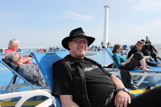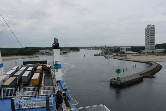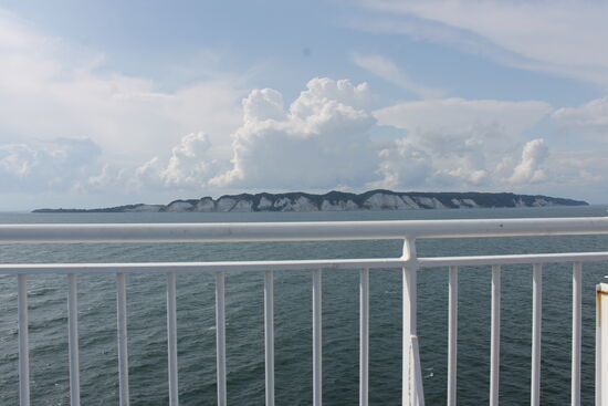 Die Reise über die Ostsee war wettertechnisch in zwei Abschnitte unterteilt. In Travemünde noch Wolken, leichter Regen mit Wind und recht frisch. Dann nach zwei Stunden: Sonnenschein und alle Plätze auf dem kleinen Sonnendeck rund um den Hubschrauberlandeplatz waren augenblicklich belegt. Auch ich habe mir einen Liegestuhl ergattert und die Vorbeifahrt an den Kreidefelsen der dänischen Insel Mon genossen.