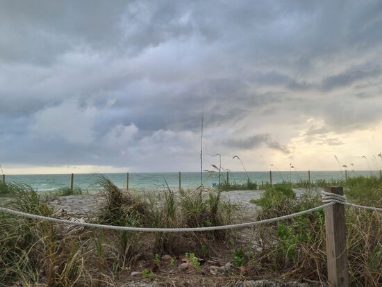 Wir ergattern 2 Schaukelstühle mit Blick auf das Meer und schon beginnt das Schauspiel. Ein richtiger Sturm zieht auf! Der Himmel ist schwarz, es stürmt. Einfach toll. Sachen werden durch die Gegend geweht und wir haben unseren Spaß dem allen zuzusehen.