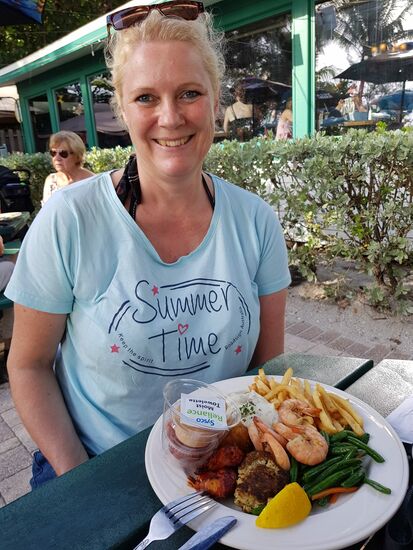 Nach 30 Minuten ist es soweit und wir können bestellen: Seafood Platter und Shrimps. Ziemlich teuer, aber der Ort, der Blick aufs Meer und die Atmosphäre sind jeden Dollar wert. Wir sind überglücklich!