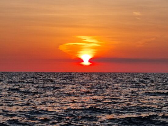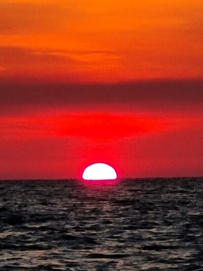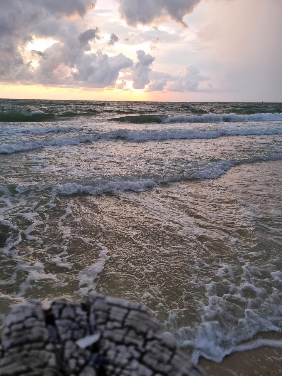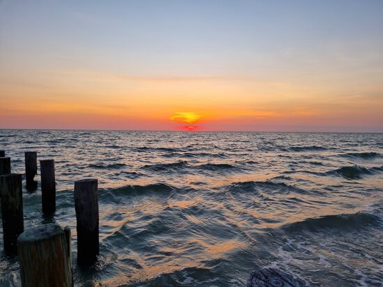 Abends gehen wir am Strand spazieren und sehen der Sonne beim Untergehen zu.
