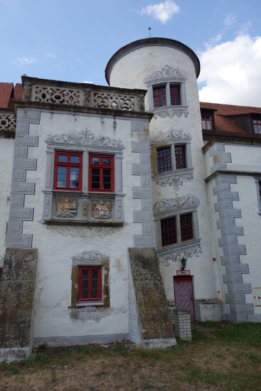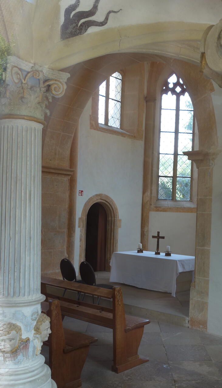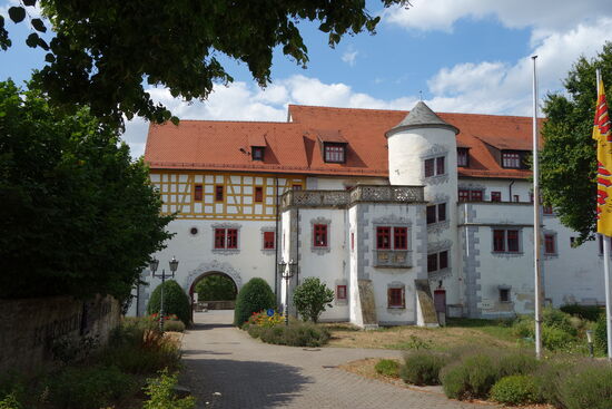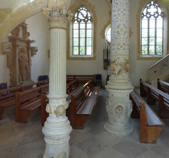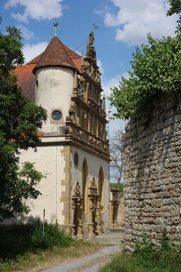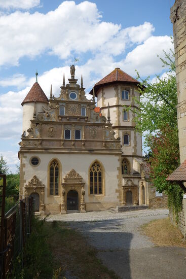 Im nördlichen Bereich befindet sich freistehend die 1599 von Jakob Müller nach dem Vorbild der Stuttgarter Schlosskirche erbaute Schlosskapelle. Die Kapelle hat einen nahezu quadratischen Grundriss und nach Süden und Norden schmuckvolle Ziergiebel, nach Osten ist ein achteckiger Chorturm angebaut, im Westen ist ein runder Treppenturm eingezogen, der einst zu den Dachgeschossen und zwei Herrschaftsemporen führte, von denen die südliche noch erhalten blieb. Die Dachformen der beiden Türme wurden nachträglich verändert. Obwohl die Portale, die Giebel und auch das Innere der Kapelle von renaissancezeitlichem Bauschmuck bestimmt sind, weist sie im unteren Bereich auch noch gotische Fenster auf. Östlich von der Kapelle erstreckt sich der Kirchgarten, westlich befand sich einst ein weiteres Gebäude.