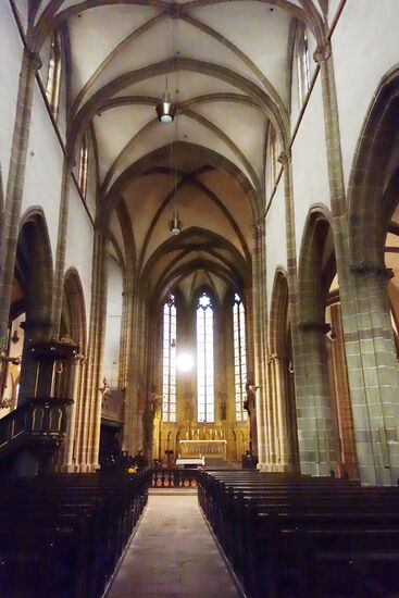 Im 13. Jahrhundert – inzwischen war westlich oberhalb der Kirche und der alten Siedlung im Tal die Stauferpfalz entstanden – war die Kirche stark verfallen und wurde ab 1269 unter Dekan Richard von Deidesheim erneuert. Als Baumeister berief er einen Steinmetz aus Paris, der die Steine „nach französischer Art behauen“ hat und damit ein Kirchengebäude im damals neuen Stil der Gotik schuf, das aufgrund seiner baulichen Merkmale mit Notre Dame in Paris und dem Straßburger Münster verglichen wird.