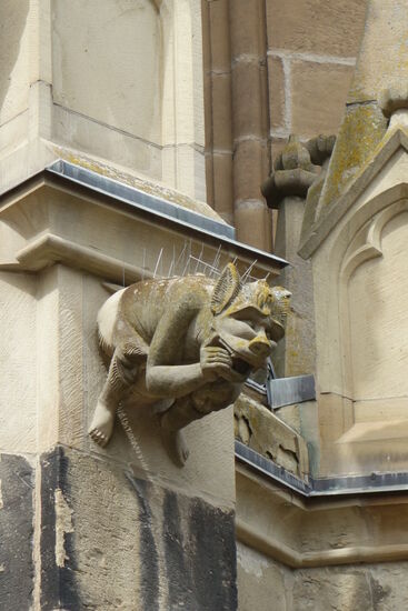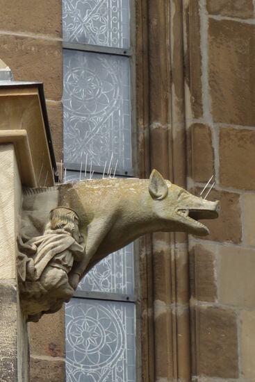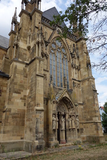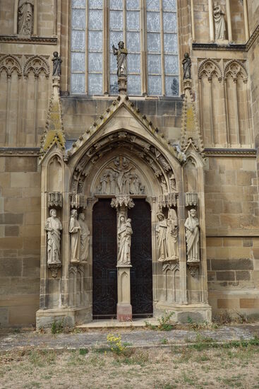 Der südlichen Querhausgiebel wird von einem großen, sechsteiligen Maßwerkfenster bestimmt, das etwa auf 1280 datiert wird. Die Giebelseite wird von Strebepfeilern begrenzt, ist mit blindem Maßwerk (Zierfenstern) versehen, von Türmchen und auf Säulen ruhenden Spitzbögen überkrönt und reich mit Figuren geschmückt.