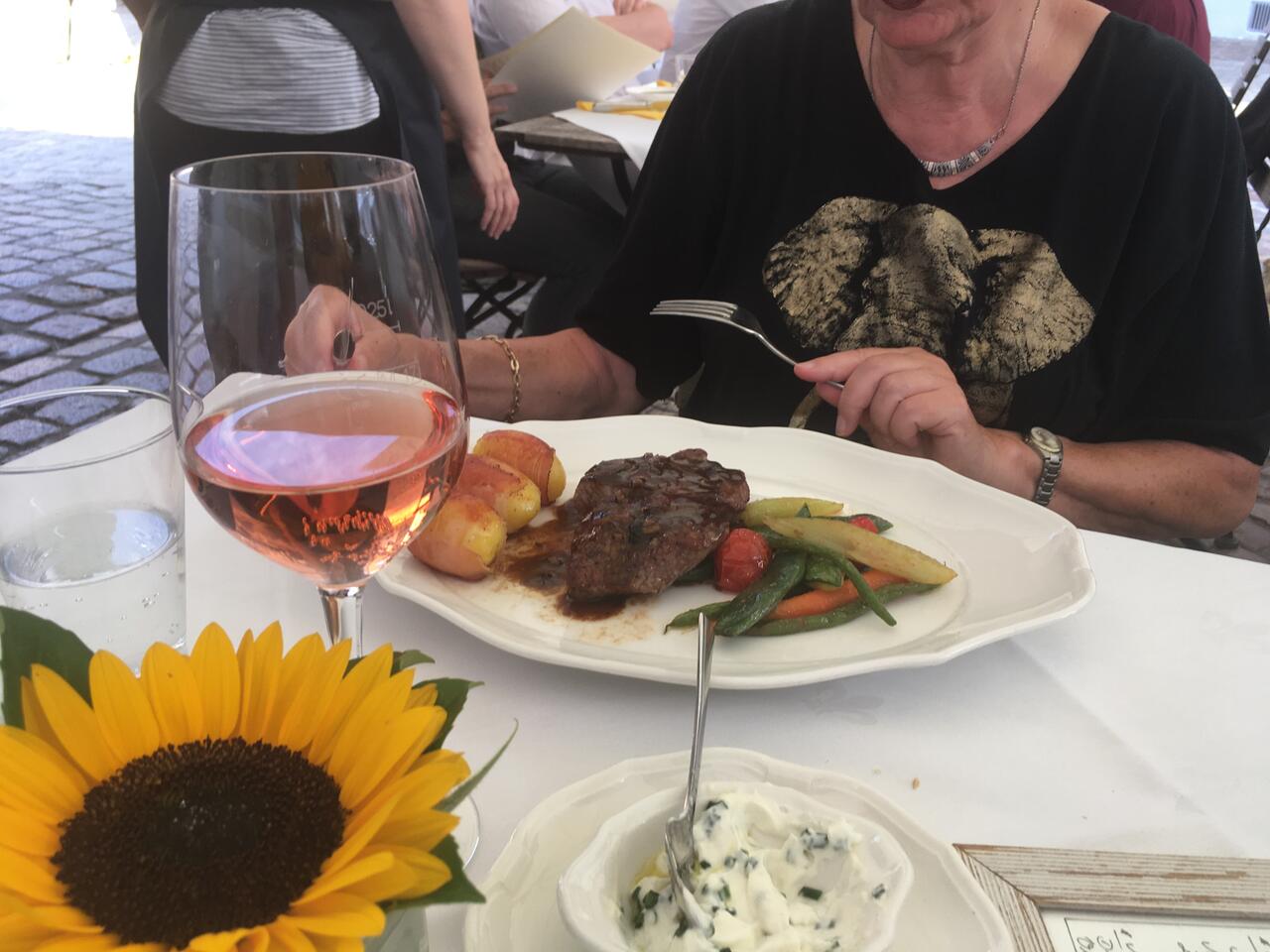 In der Weinstube Feyerabend Bad Wimpfen - wenige Geminuten von unserem Domizil - genießen wir draußen die Abendsonne bei Trollinger Rosé und einem kleinen Menu.