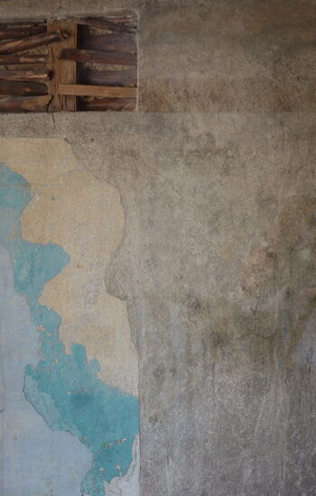 Der Blick ins Innere der Wand zeigt, dass die Gefache aus Steckscheiten, gewundenen Hölzern („Wand" kommt von „winden"!) und Lehm als Füllmaterial bestehen. Darauf wurde im 16. Jahrhundert eine typische Fachwerkdekoration angebracht, wie sie im rechten Feld großflächig freigelegt ist. Im Laufe der letzten 400 Jahre wurde die Wand mindestens dreißigmal neu gestrichen. Von diesen vielen Anstrichen sind in der Musterstratigraphie oben im linken Feld über dem Verputz 13 Schichten freigelegt, die sich z.T. datieren lassen. So ist beispielsweise in Schicht 23 ein Ultramarinblau verwendet, wie es erst seit 1823 hergestellt wird. Ab dieser Zeit sind kräftigere Farbgebungen zu erkennen, während vorher Weiß und gedämpfte Erdfarben (ocker, grüne Erde) vorherrschen.