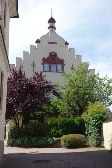 Auf den Grundmauern der ehemaligen Pfarrkirche St. Cäcilia wurde 1558/59 das heutige Rathaus errichtet.