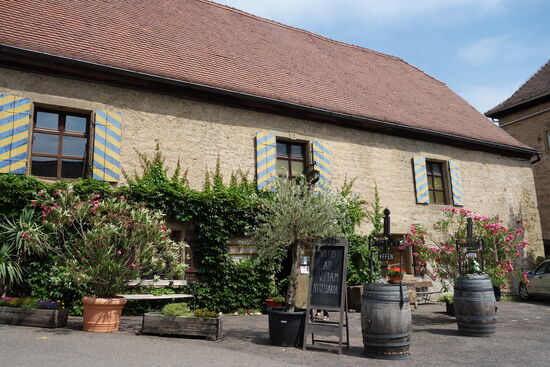 Nur der Weinverkauf hat geöffnet, der Herr dort empfiehlt uns einen Biergarten in Gundelsheim, den wir im Anschluß besuchen.