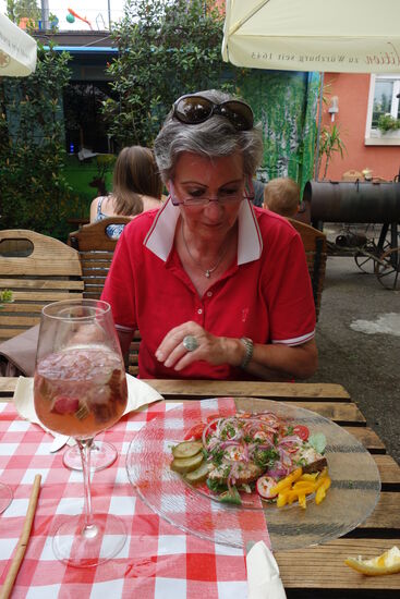 Dort gibt es dann die ersehnte Erfrischung: ein Glas Wein und für den Fahrer eine Rhabarberschorle und gegen den kleinen Hunger ein 'gemeinsames' Schmalzbrot.
