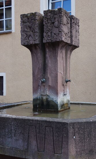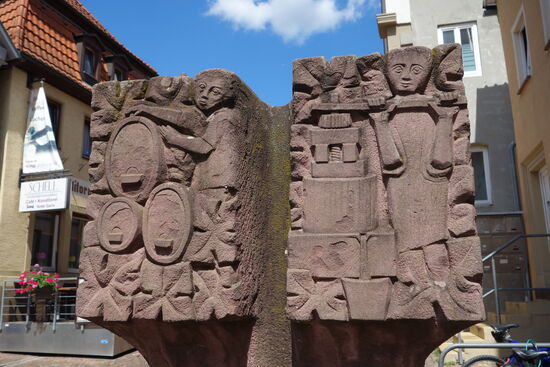 Der Brunnen zeigt in den Reliefs Arbeit und Frohsinn rund um den Wein. Er ist ein Werk des Gundelsheimer Bildhauers Ludwig Herold aus dem Jahr 1974.