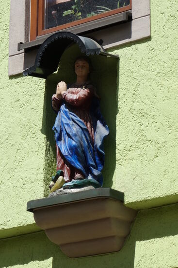 Davor, auf dem Sockelstein von 1777, eine Säule mit einfacher Marienstatue vom Typus der Maria Immaculata. Diese Form der Madonnen-Darstellung war besonders zur Rokokozeit sehr beliebt.