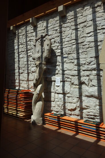 Im Foyer ist ein Bildstock aus dem Jahr 1516 aufgestellt, der früher an der Straße nach Böttingen stand. Er ist als „Baum der Erkenntnis" (Paradiessymbol) gestaltet, der wegen des Sündenfalls abstarb und verdorrte. Die den Baum krönende Kreuzigung Christi steht für die Erlösungvon den Sünden und für das ewige Leben.