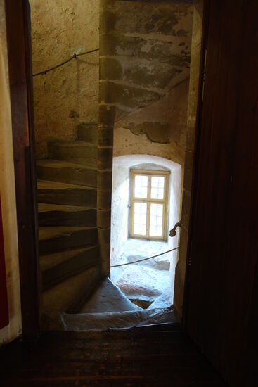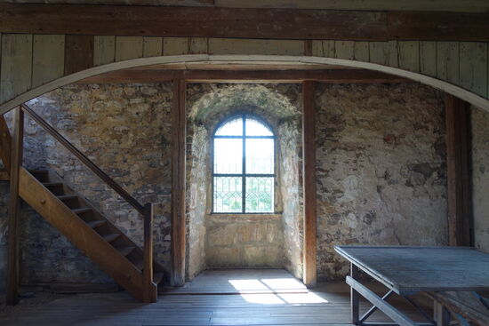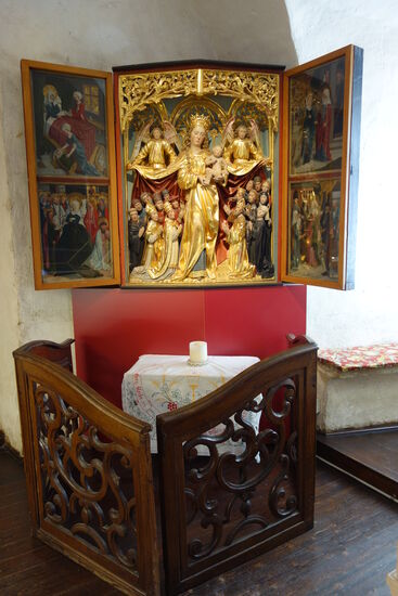 Die Altäre stammen aus der Burgkapelle, der Kirche, die unterhalb der Burg einsam im Wald steht und nur über einen Fußweg zum äußeren Tor hinaus erreichbar ist.
