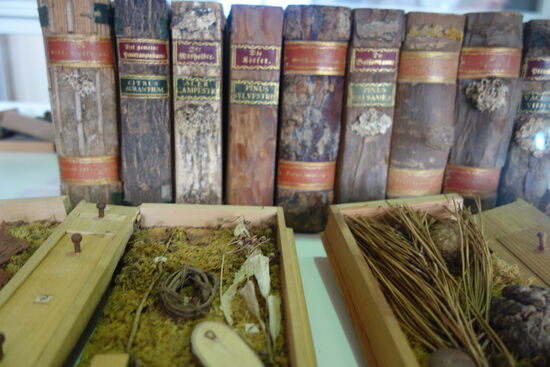 Diese Sammlung von 93 Bänden, die wie Bücher aussehen, besteht aus kleinen hölzernen Kästchen, die jeweils eine Baum- oder Strauchart beschreiben.