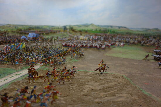 Am 6. Mai 1622 kam es dann zur Entscheidungsschlacht bei Wimpfen, genauer gesehen auf dem Obereisesheimer Feld im Bereich der heutigen Böllinger Mühle. Ein gewaltiges Heer war angetreten - über 36 000 Mann waren an dieser Schlacht beteiligt! In unserem Schaubild sind davon nur 10%, also 3 600 Soldaten, in handgemalten Zinnfiguren dargestellt. Die Schlacht war ein blutiges Gemetzel, am Abend dieses denkwürdigen Tages hatte jede Seite etwa 5000 Töte zu beklagen! Wenn man bedenkt, dass dies in sozusagen ehrlicher Handarbeit vollbracht worden war, so war das eine reife Leistung||