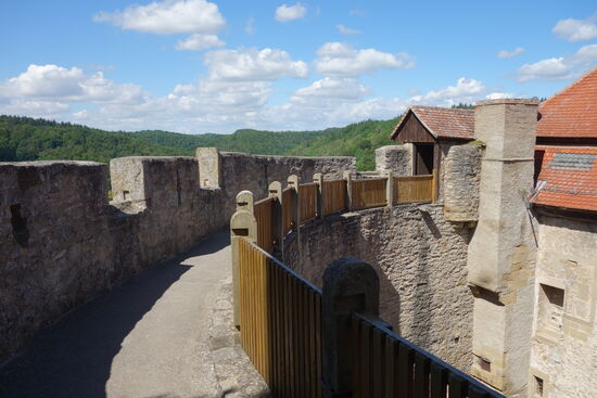In der zweiten Hälfte des 15. Jahrhunderts entstanden auch der große turmbewehrte Zwinger und eine Vorburg mit Steingebäuden. Burg Guttenberg erreichte in dieser Zeit ihre größte Ausdehnung und Blüte. Die Ringmauer wurde mit breiten und tief herabgezogenen Schießscharten („Senkscharten") für Feuerwaffen versehen. Auch der Bergfried erhielt nun seine beiden oberen Stockwerke.