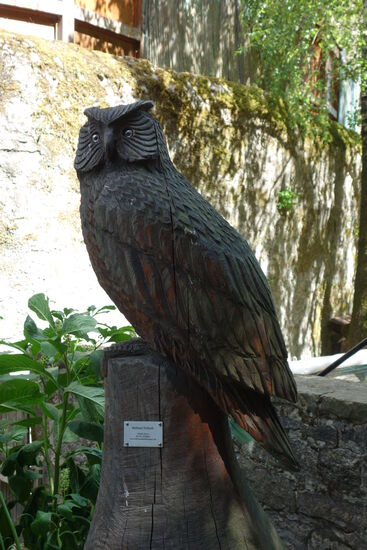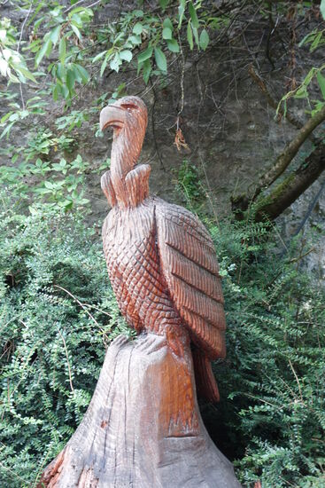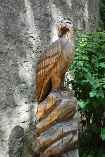 Am Zugangsweg stehen geschnitzte Greifvögel.