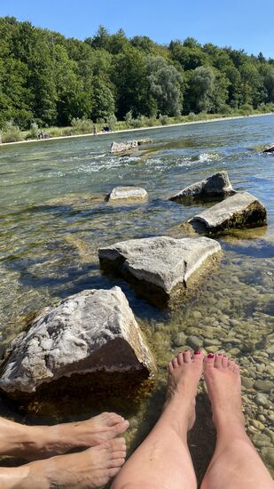 Ein paar Jugendliche fragen höflich , ob sie hier ins Wasser dürfen und sie uns nicht stören--wieder fällt mir auf, wie zugänglich und kontaktfreudig die Münchner sind