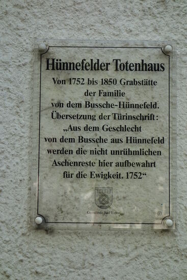 Aud der Süsseite des Kirchplatzes steht das Hünnefelder Totenhaus, das von der Adelfamilie von den Bussche von 1752 bis 1850 als Grabstätte genutzte wurde.