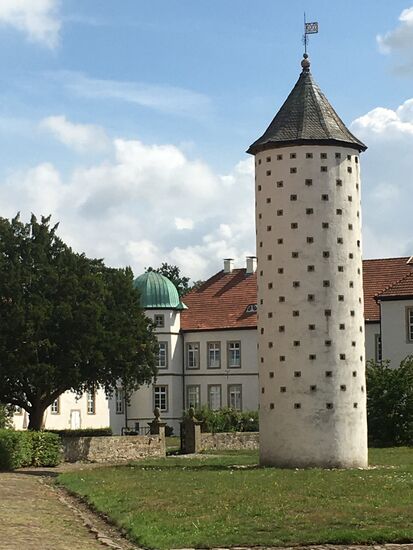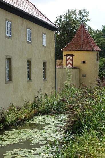 Hünnefeld wurde erstmals im Jahre 1146 urkundlich erwähnt. Die dreiflügelige, zweigeschossige Anlage wurde 1600 bis 1614 erbaut (1658 südlicher Seitenflügel) zeigt heute noch die schlichte Gliederung der Spätrenaissance. Die gesamte Anlage ist von zwei Wassergräben umgeben.