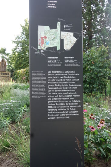 Das Besondere des Botanischen Gartens der Universität Osnabrück ist seine Lage in zwei Steinbrüchen. Im ersteren wird die Vielfalt von weltweiten Pflanzengemeinschaften gezeigt. Ein Highlight ist das Amazonas-Regenwaldhaus, das sich markant von der Steinbruchkante absetzt. Der zweite, naturnahe Steinbruch widmet sich den heimischen Pflanzen und bietet innerstädtisch einen geschützten Naturraum zur Entfaltung. In dieser Dualität ist der Garten seit 1984 eine unverzichtbare Ressource für Forschung und Lehre, für Schutzmaßnahmen zum Erhalt heimischer Biodiversität und für öffentlichkeitswirksame Bildungsarbeit.