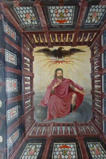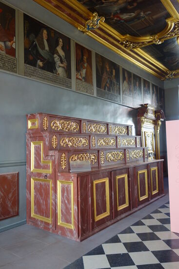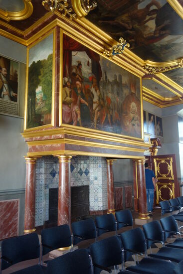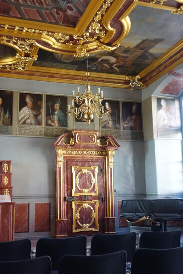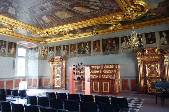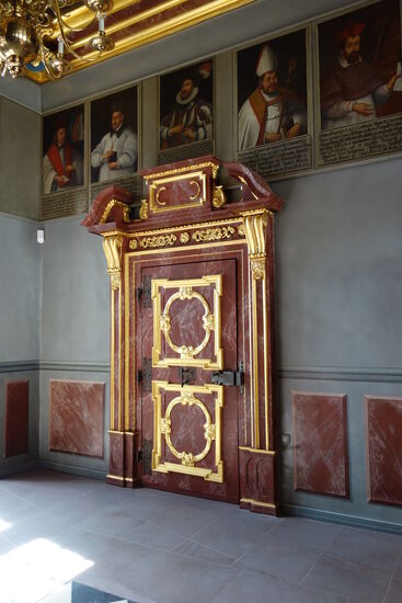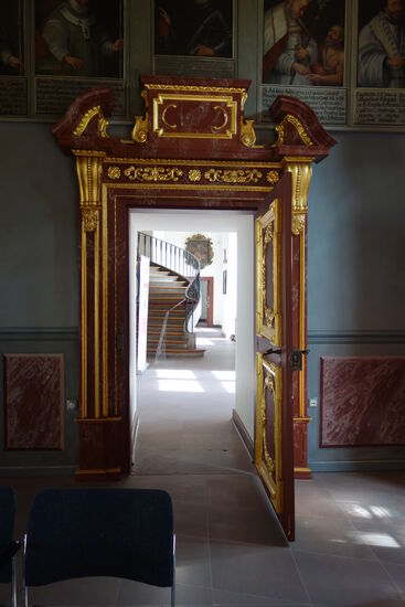 Der Rittersaal des Schlosses von zwölf mal 15 Meter Größe wurde im ersten Jahrzehnt des 17. Jahrhunderts von Fürstbischof Philipp Sigismund von Braunschweig-Wolfenbüttel als Jagd- und Speisesaal geschaffen, während des Dreißigjährigen Kriegs 1633 bis 1650 unter schwedischer Besatzung jedoch schwer beschädigt.