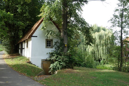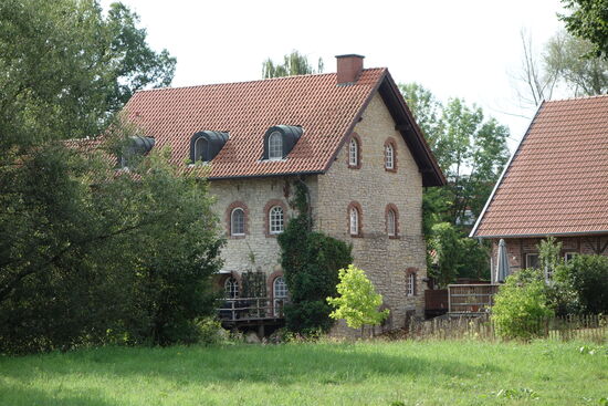 Wenn hier auch schon lange keine Mühlrad mehr klappert, die vielen steinernen Räder rund um das schmucke Kalksandsteingebäude weisen auf die einstige Nutzung hin. Die Mühlsteine im Vorgarten sind Borgmühlen-Originale, ein weiterer wurde ins Hofpflaster eingefügt. „Mein Vater hat im Lauf der Jahre noch einige zusätzliche Mahlsteine hier versammelt“, weiß Mühlenbewohnerin Sylvia Huster.