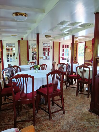 Neben einigen Schweden kamen die meisten Passagiere aus Deutschland, einige aus der Schweiz und wohl auch ein Paar aus den USA. Die Kabinen waren sehr eng, aber wir hatten ein richtiges Doppelbett, wie in unserem Wohnwagen. Unsere Kabine lag auf dem Hauptdeck ganz hinten. Wegen der Deckenhöhe mußte Rainer immer gebückt gehen, Christa hatte da keine Probleme. Oben im Speisesaal gab es aber einige Stellen, wo er gerade stehen konnte.