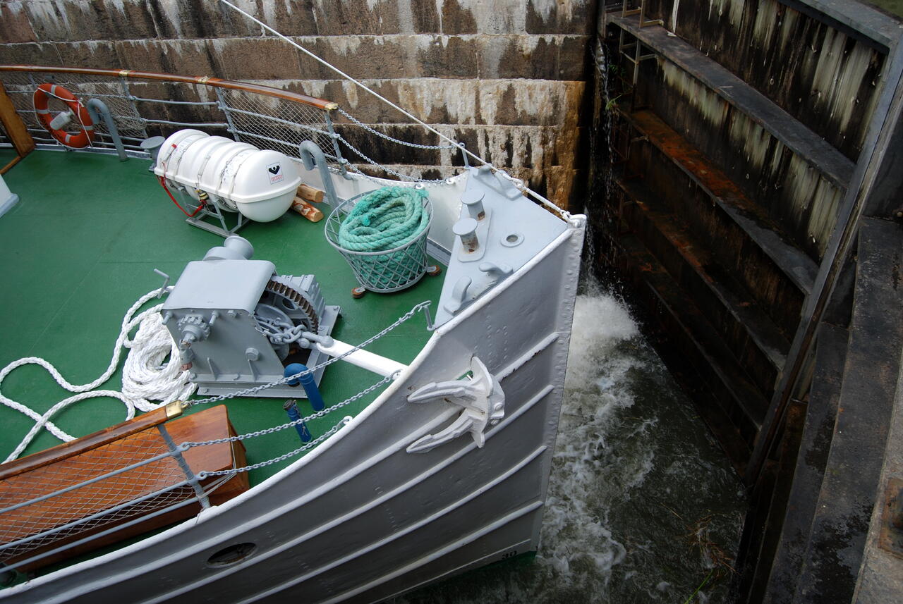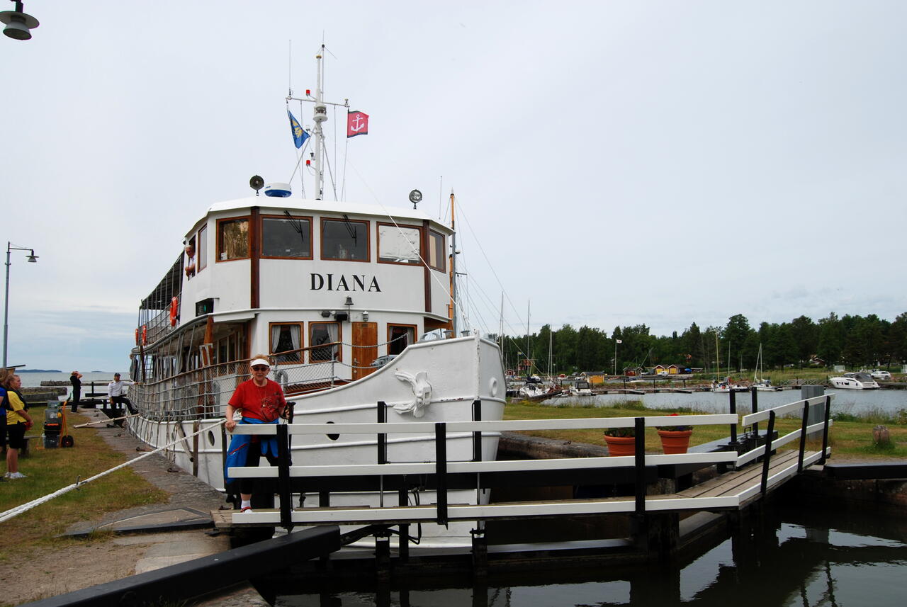 2 Stunden Aufenthalt. Wir bekamen eine Führung durch das Schloß. Nach einem Blick in den Schloßgarten ging es zurück zum Schiff. Weiter ging die Fahrt über den Vänern durch die Mariestad vorgelagerten Inseln. Dann erreichten wir Sjötorp. Hier begann nun der Götakanal mit den ersten 8 der 58 Schleusen. Sie lagen in 2er-Gruppen über einige Kilometer verteilt. Wir konnten das Kanalmuseum besichtigen und ein Stück an Land dem Schiff folgen.