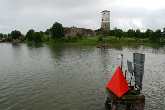 Am Schloß hatten wir eine Stunde Zeit für eine Führung. Schon zur Vikingazeit gab es hier Sperren im Wasser durch Holzpfosten. In den 1200er Jahren wurden die ersten Befestigungen gebaut. Zu Gustav Vasas Zeiten und danach wurde das Schloß mehrfach um- und ausgebaut. Um 1700 wurde das Schloß verlassen und später zerstört. Leider gab es einen tüchtigen Regenschauer. Wir konnten uns unter einigen Blechdächern unterstellen und die Informationen lesen. Als der Regen nachließ kletterte Rainer noch auf den Turm und traf dort die schwedische Gruppe. Christa ging mit einigen anderen durch den schönen Garten zurück zum Schiff.