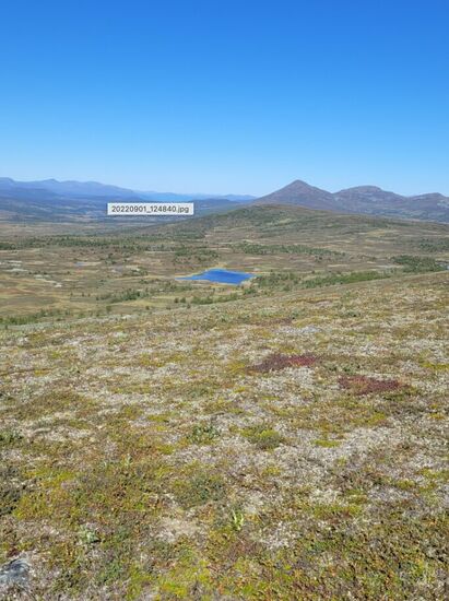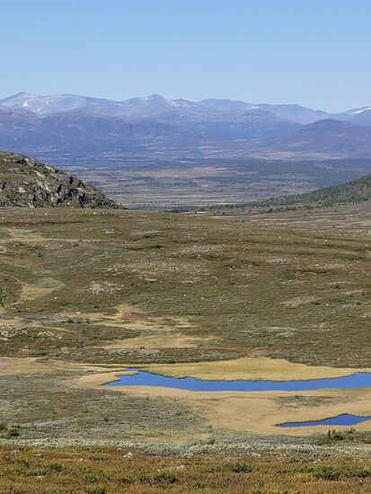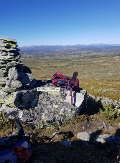Wieder wolkenlos. Wir starten so gegen 09:30 los, da wir wissen, dass die Strecke nicht so lang ist. Zuerst kurz wieder retour hinauf, einen See entlang und dann weiter Richtung Nordwest einen großen Berg (Hang, Hügel), wie auch immer man das nennen will, hinauf. Pascal nannte ihn den "Rodelhügel" . Der Rodelhügel gestaltet sich wandertechnisch schwieriger als erwartet. Ungute Querungen auf glattem Fels. Bei Nässe möchte ich hier nicht unterwegs sein. Nach rund 2,5 Stunden öffnet sich ein weites Tal, in dem genau "nichts" ist. Sumpf und Birkenwälder - endlos!. Monika verortet den einen oder andern Elch, der sich jedoch leider als Stein entpuppt.