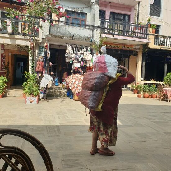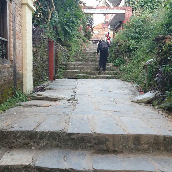 Ines schwant Böses, als es nach Sarangkot nochmal in die Berge geht. Die Treppen machen ihr wirklich zu schaffen und bei hohen Stufen braucht sie ständig Unterstützung. Alleine wäre das für sie gar nicht machbar. Wie gut, dass Maritta da ist!