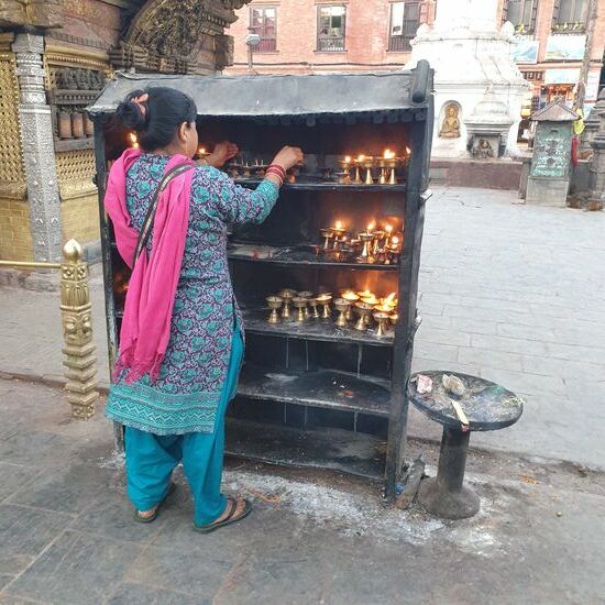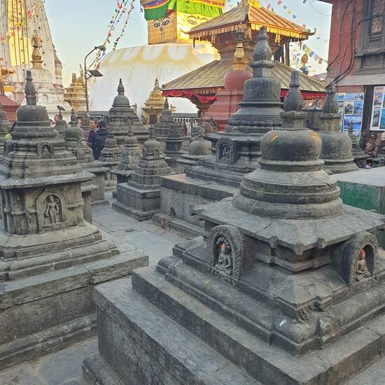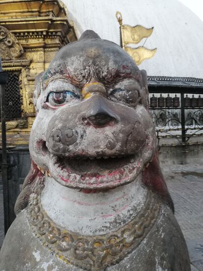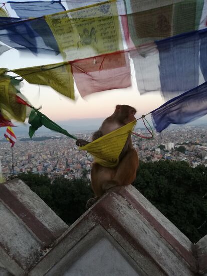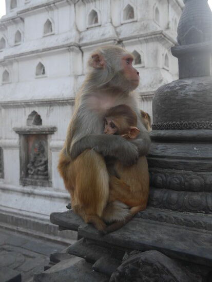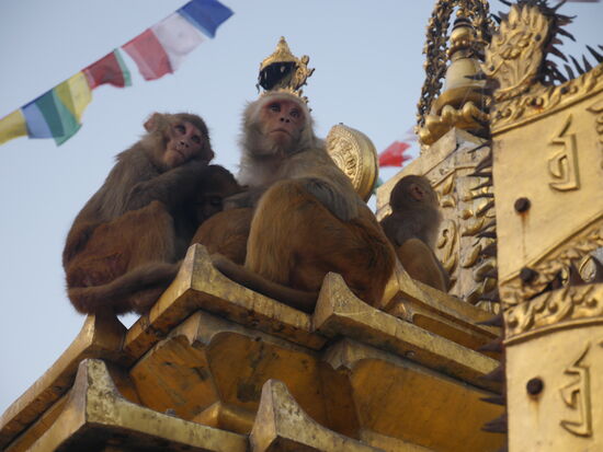 Deshalb sind wir auch erst relativ spät zu einem weiteren Higlight in Kathmandu aufgebrochen. Die Swayambhu Stupa, Affentempel genannt, liegt auf einem Berg und Ines wird bei den vielen Stufen ganz schwindelig. Die eigentlichen Stars dieses Tempels sind die Makaken, die hier zu Hunderten herumlaufen. Nebenbei bemerkt: Es gibt fast genauso viele Hunde.