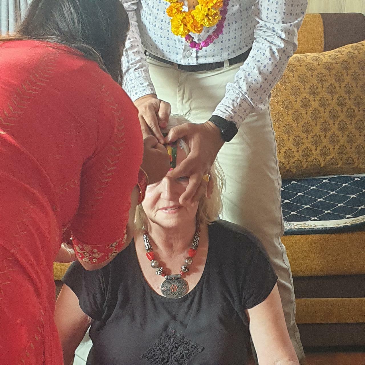 Unser letzte Reisetag fällt auch auf den letzten Tag - und damit den Höhepunkt - des Diwali Festes. An diesem Tag werden in Nepal die Brüder und Schwestern geehrt. Wir waren bei Santosh eingeladen, in dessen Haus es schon wie in einem Bienenstock summte. Neben den Kindern und seiner Frau waren auch seine Mutter, Schwester und zwei Onkel eingeladen. Die Vorbereitung für das Tika - das Ehrungszeichen auf der Stirn – war lang und laut. Nebenbei gab es etwas zu Essen, Farben und Blumenketten wurden bereitgelegt. Tatsächlich wurde die Ehrung nur von den Geschwistern vorgenommen. Nach den Erwachsenen, waren die Kinder dran - und dann auch wir.