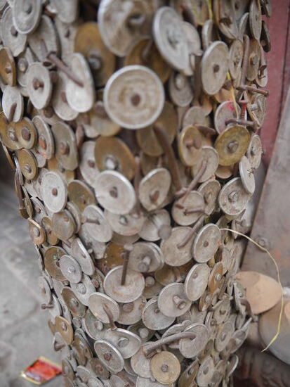 An einem unserer Streifzüge durch unser Veedel haben wir etwas merkwürdiges entdeckt: Ein Holzstab, der über und über mit Münzen benagelt ist. Daneben befindet sich ein amorphes Holzgebilde, das ebenfalls mit Münzen bedeckt ist. Leider ist es von einer Plastikumhüllung verdeckt.