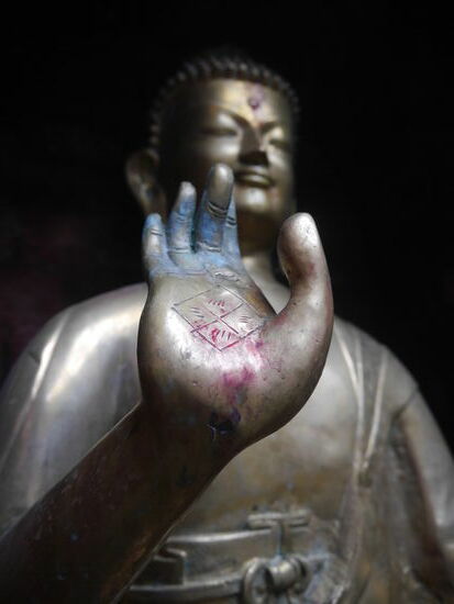 Kein Tempel, kein Schrein ohne Spiegel. Wir rätseln und spekulieren über deren Bedeutung und denken uns abstruse Dinge dabei aus. Leider ist die Auflösung ganz profan: das Tikka will wohl zwischen den Augen platziert werden.