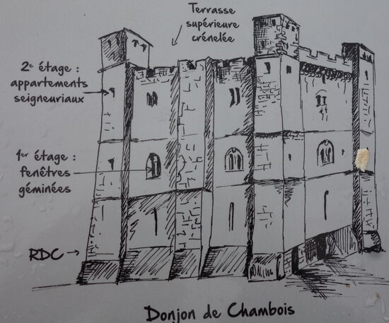 Dieses romanische Gebäude aus dem 12. Jahrhundert ist eines der am besten erhaltenen in Frankreich. Der Turm ist 21,40 m lang, 15,40 m breit und 26 m hoch. Der Innenraum war in drei Etagen mit Böden unterteilt. Das Erdgeschoss diente Wohnzwecken, im ersten Stock befand sich der Rittersaal des Schlosses und im zweiten die herrschaftlichen Gemächer. Die obere Terrasse war ursprünglich zinnenbewehrt und erhielt zwischen dem 14. und 15. Jahrhundert einen überdachten Wehrgang. Es wird an den Ecken von vier quadratischen Türmen flankiert. Der nördliche Eckturm diente als Latrine und Abwasserentsorgung. Das Gebäude wurde 1901 unter Denkmalschutz gestellt und gehört dem Departement Orne.
