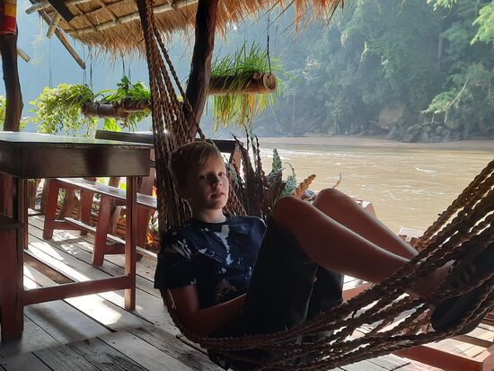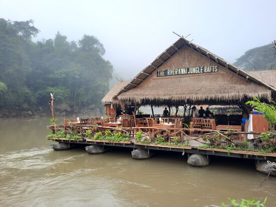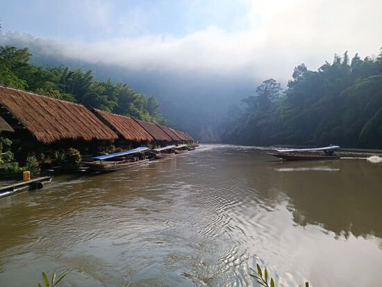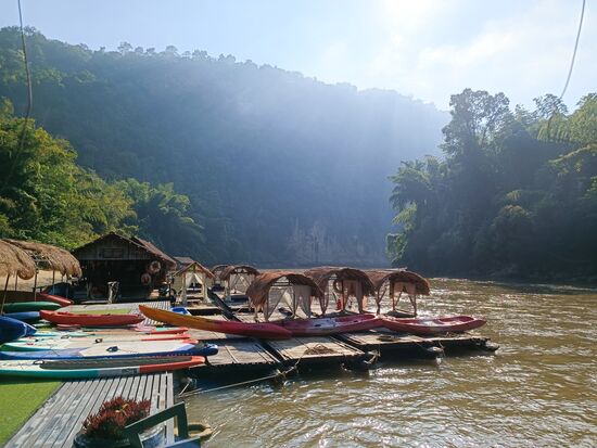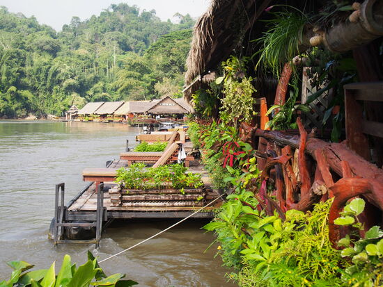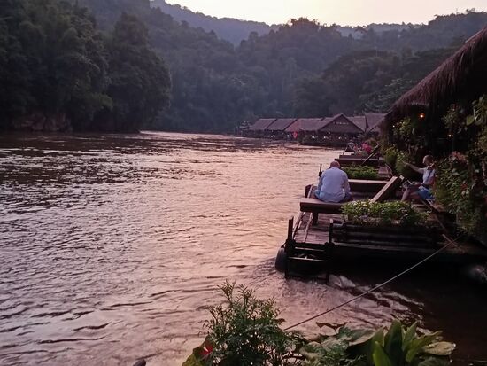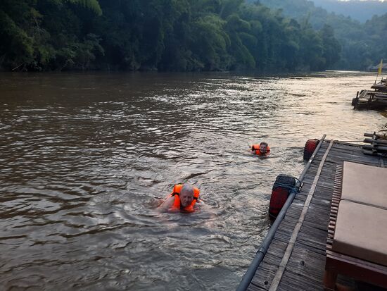 Am Nachmittag gegen 17.15 Uhr zurück. Und Raphael freute sich noch auf ein weiteres Highlight des Tages. Lifejacket an (diesmal nicht grundlos). Am oberen Ende der Anlage Sprung ins Kwai-Wasser und treiben lassen und am unteren Ende (sicher 250 m) wieder anlanden…ein bisschen muss man aufpassen, es ist schon eine heftige Strömung. Haben viele gemacht, auch Familien mit kleineren Kindern. Simone hat gestreikt. Sicher, der River Kwai ist kein klarer Gebirgsbach, aber schön war´s trotzdem.
