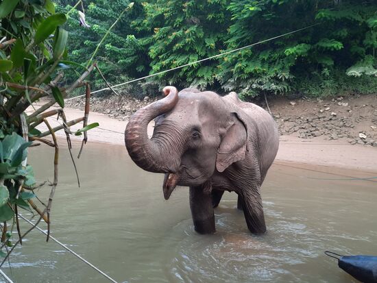 Wir hatten am Vorabend erfahren, dass zwischen 7.30-8.00 Uhr ein Elefant regelmäßig am Ufer sein Frühstück abholt, also kein Ausschlafen, sondern bereits 7.00 Uhr klingelte der Wecker. Aber der Anlass war ja erfreulich. Es war ein halbwüchsiger Elefant, der um Futter bettelte.