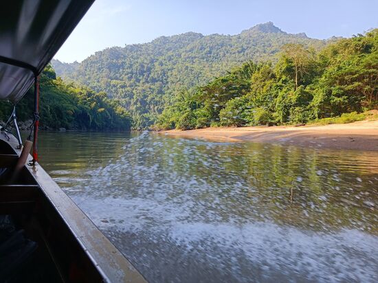 Und dann auch gleich 9.00 Uhr mit dem stündlich verkehrenden Boot gestartet zum Pier und mit dem Auto zum Erawan NP gedüst (1 h).