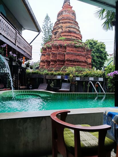 Also werfe ich mit Raphael den ersten Blick nach draußen, der Pool schön angelegt, etwas übersichtlich in der Größe, mit einer alten Chedi im Hintergrund.