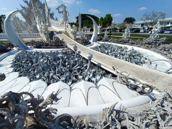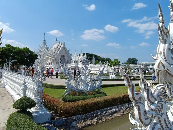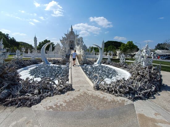 Etwas südlich von Chiang Rai liegt Wat Kong Rhun, der weiße Tempel, also Zwischenstation. Schon beim Anfahren wird man fast geblendet von der Mischung aus Weiß und Silber Der Tempel ist zwar im eigentlichen Sinne kein Tempel sondern ein immer noch im Bau befindliches Kunstwerk - aber wirklich toll anzuschauen - und das alles aus weißem Gips und Spiegelfliesen. Ein Muss beim Besuch von Chiang Rai.