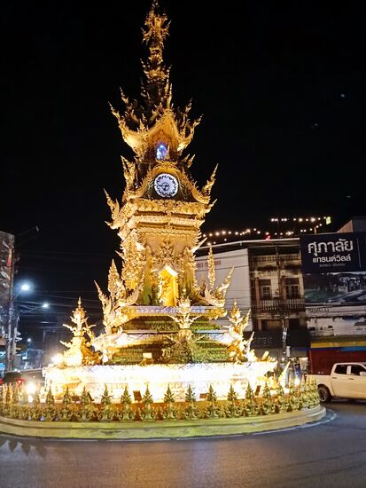 Eingecheckt im Pan Khled eco hill ressort. Etwas außerhalb, eine Bungalowanlage mit einem ziemlich großen Pool. Noch schnell erfrischt und ab in die Stadt. Viel kleiner als Chiang Mai, eigentlich wollen wir noch eine Trekking-Tour für Mittwoch buchen, aber damit haben wir kein Glück oder sind zu wählerisch. Also einfach mal so in der Stadt treiben lassen. Der angestrahlte Clocktower ist nicht zu übersehen.