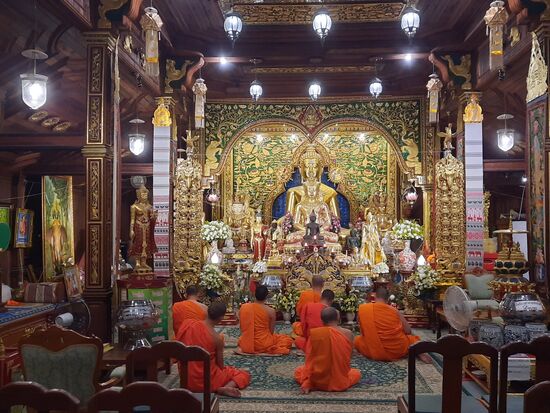 Drinnen Mönche beim Meditieren. Simone hätte am Liebsten mitgemacht, ihr fehlte aber das passende Gewand.