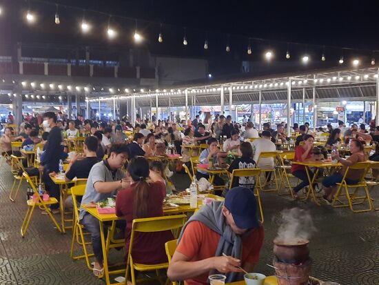 Weiter zum Nachtmarkt, wir haben Hunger. Angeschlossen ist ein großer Food Court. Ringsherum die Essenstände mit einer riesigen Auswahl. Hier gibt´s auch ein Bier zum Abendessen. In der Mitte die Tische, dazu Livemusik. Die Besucher sind sowohl Einheimische wie auch Touris.