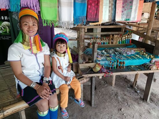 Unweit von unserem My Guest Resort war ein Longneckdorf ausgeschildert. Keine Touren dorthin, also vielleicht doch nicht so ein Zoo? Es war klein und übersichtlich, es kostete Eintritt, ein paar verblasste Kopien erzählten etwas zur Herkunft in den 80ern aus Myanmar.