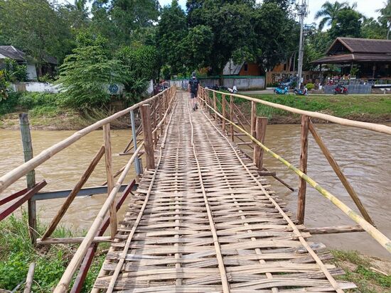 Der Weg hier führt über den River Pai über eine Bambusbrücke, es gibt aber noch die richtige Fahrzeugbrücke.